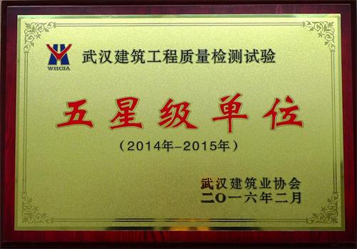2013年我公司被武漢建筑業協會選為檢測試驗工作委員會副主任委員單位,2012-2017年連續五年被評為先進單位,2013、2015、2017年連續三屆被評為武漢市建設工程質量檢測機構五星級檢測單位。2017-20…